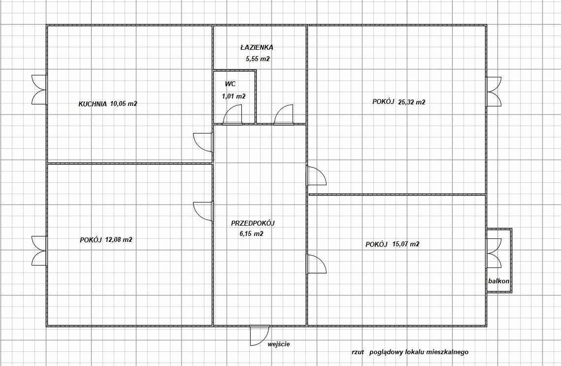 Pomieszczenia - Mieszkanie składa się z: kuchni (10,05 m2), 3 pokoi (25,32 m2, 15,07 m2, 12,08 m2), łazienki (5,55 m2), WC (1,01 m2) i przedpokoju (6,15 m2). Do mieszkania przynależy duża piwnica ok 25 m2. Mieszkanie posiada balkon.