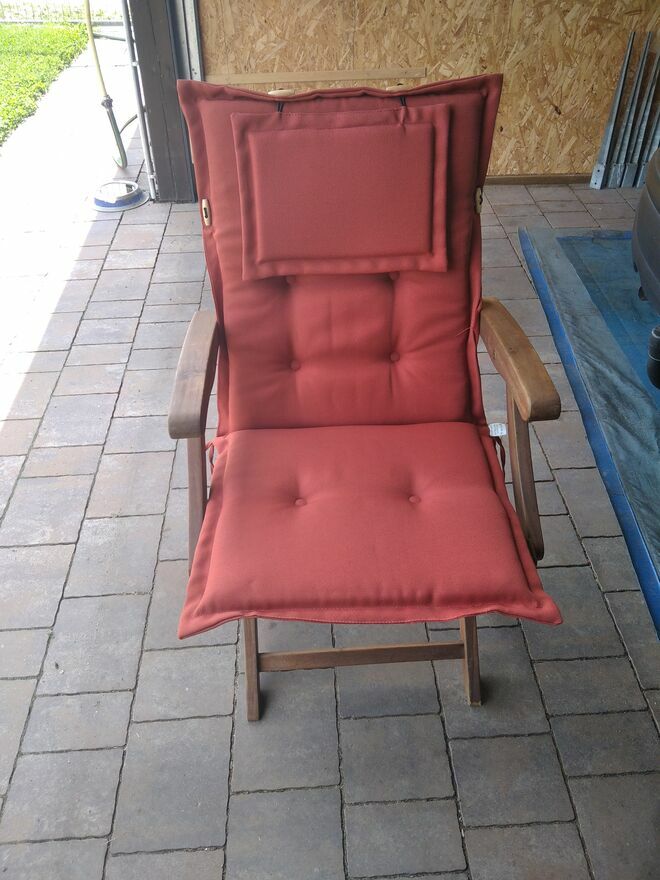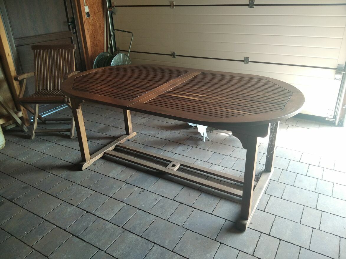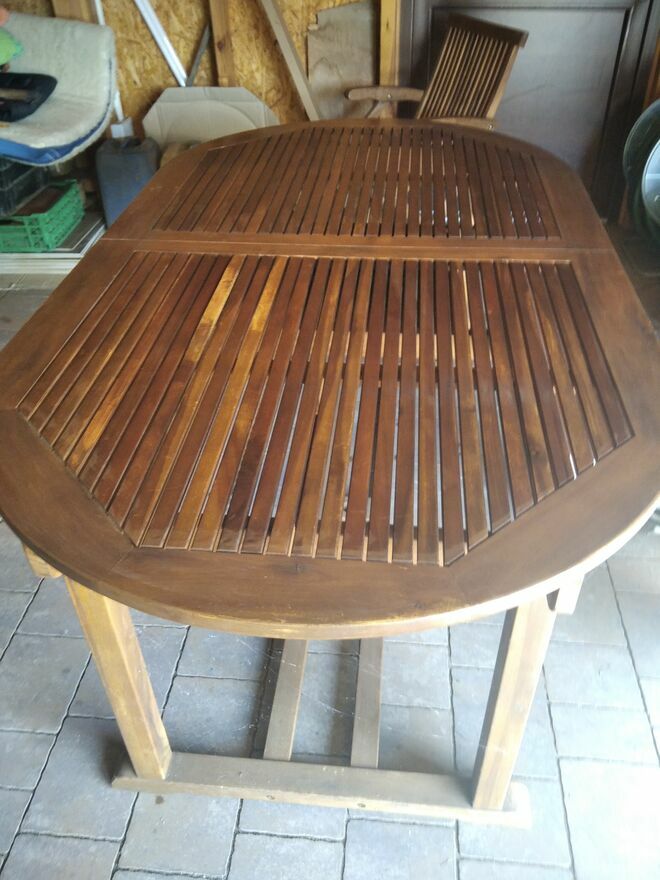 Witam sprzedam zestaw ogrodowy drewniany kompletny. Stół. 8 krzeseł składanych i.poduszki.Do odświeżenia.